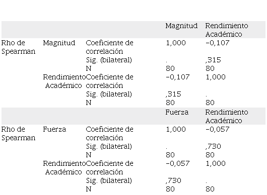 Finalmente, para la dimensión fuerza, según los resultados de la Tabla 2, se tiene que el coeficiente de correlación, Rho de Spearman entre la dimensión fuerza y la variable rendimiento académico es de -0,057 revelando una correlación baja. Además, la significancia de p valor es igual a 0.730 (p>0.05), aceptando la hipótesis nula por lo que se afirma que Ho: No hay una relación significativa entre el rendimiento académico y la dimensión fuerza de la autoeficiencia en estudiantes en una institución educativa de Lima.