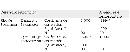 Respecto al desarrollo psicomotor y el aprendizaje a la iniciación de la lectoescritura, de acuerdo a los resultados obtenidos por el coeficiente de correlación de Spearman se tiene el p valor= 0,00 < 0,005 y el coeficiente de rho de Spearman = 0,599 por lo que se confirma que existe una relación significativa positiva y moderada entre las variables desarrollo psicomotor y aprendizaje a la iniciación de la lectoescritura. Es así que se acepta la hipótesis alterna H1: Existe relación significativa entre el desarrollo psicomotor con el aprendizaje a la iniciación de la lectoescritura (Tabla 1).