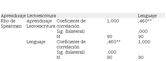 Respecto a la relación entre la dimensión lenguaje del desarrollo psicomotor y el aprendizaje de iniciación de la lectoescritura, de acuerdo a los resultados obtenidos por el coeficiente de correlación de Spearman se tiene el p valor= 0,00 < 0,005 y el coeficiente de rho de Spearman = 0,460 por lo que se afirma que existe una relación significativa positiva y moderada entre las variables lenguaje y aprendizaje a la iniciación de la lectoescritura. Por lo que se acepta la hipótesis alterna H1: Existe relación significativa entre el lenguaje con el aprendizaje a la iniciación de la lectoescritura (Tabla 2).