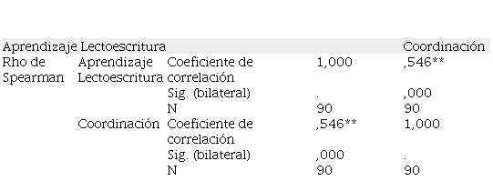Respecto a la relación entre la dimensión coordinación del desarrollo psicomotor y el aprendizaje de iniciación de la lectoescritura, según lo obtenido por el coeficiente de correlación de Spearman se tiene el p valor= 0,00 < 0,005 y el coeficiente de Spearman = 0,546 por lo que se afirma que existe una relación significativa positiva y moderada entre la coordinación y el aprendizaje a la iniciación de la lectoescritura. Por lo que se acepta la hipótesis alterna H2: Existe relación significativa entre la coordinación con el aprendizaje a la iniciación de la lectoescritura (Tabla 3).