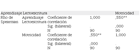 Respecto a la relación entre la dimensión motricidad del desarrollo psicomotory el aprendizaje de iniciación de la lectoescritura, según lo obtenido por el coeficiente de correlación de Spearman se tiene el p valor= 0,00 < 0,005 y el coeficiente de Spearman = 0,550. Por lo que las variables tienen una correlación moderada. Aceptando la hipótesis alterna H3: Existe relación entre el aprendizaje a la iniciación de la lectoescritura y la motricidad. Es decir, si la motricidad incrementa, incrementarán los valores de aprendizaje a la iniciación a la lectoescritura. (Tabla 4).