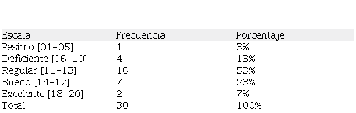 Los resultados de la prueba de entrada muestran que un estudiante que representa el 3% de la población se ubicó en la escala de pésimo, 17 estudiantes que representan el 57% de la población se ubicaron en la escala deficiente, así mismo se obtuvo que 8 estudiantes que representan el 27% de la población alcanzó la escala regular, también se tiene 3 estudiantes que representan el 10% en la escala de bueno, mientras que en la escala de excelente se halló un estudiante. De estos resultados se puede afirmar que los estudiantes de la carrera profesional de Administración de Recursos Agropecuarios y Forestales se encuentran en su mayoría en un nivel de logro de aprendizajes en la escala de deficiente (Tabla 1).
