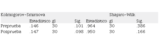 La prueba de normalidad Shapiro-Wilk para la prueba de entrada indica un valor de 0.964 con un p valor de 0.386 el cual es mayor al propuesto (p>0.05), por lo tanto, se asume que la distribución de datos es normal. Para la prueba de salida se obtuvo un valor estadístico de Shapiro-Wilk de 0.950 con un p valor de 0.166 que es mayor al propuesto (p>0.05) por lo tanto se asume que la distribución de los datos de la prueba de salida es normal. En consecuencia, se opta por la aplicación de la prueba estadística T para muestras relacionadas (Tabla 3).
