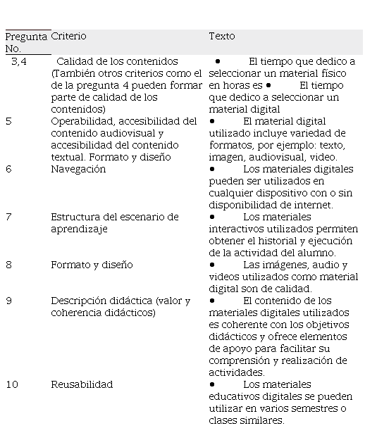 La muestra fue constituida por 80 docentes que imparten clases a nivel superior adscritos a diversos planes de pregrado en la UNICACH, los que representan el 13.61% del total de docentes en Ciudad Universitaria y Campus de la universidad en Tuxtla Gutiérrez. Es conveniente aclarar que el criterio para seleccionar a la muestra es que los sujetos son docentes compañeros de trabajo, en virtud de que la pandemia COVID-19 ha limitado una investigación a mayor escala. Para este efecto se aplicó el instrumento de medición elaborado con base en los elementos que se establecen en el Anexo F de la Norma UNE 71362 Calidad de los materiales educativos digitales (MED), que se refieren a la búsqueda y selección de material digital, desarrollo de contenidos educativos digitales e integración y reelaboración de contenidos educativos digitales y se presentan en la Tabla 1.
