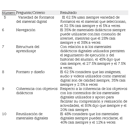 La Tabla 2 presenta el concentrado de resultados a las preguntas 5-10, encontrándose como información principal que más de un tercio de los encuestados a veces utiliza material didáctico que puede utilizarse sin conexión, el 45% puede seguir el historial de ejecución del alumno, 62.5% considera que el formato y diseño de los materiales utilizados son de calidad, el 80% utiliza materiales que son coherentes con los objetivos didácticos de su curso y casi la mitad considera que puede reutilizar los materiales digitales que utiliza.