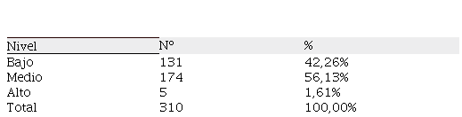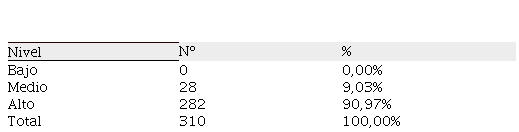 En relación a la variable autoeficacia, tal como se aprecia en la Tabla 1, resalta el nivel medio de autoeficacia representado por el 56,13% del total de individuos evaluados, seguido del nivel bajo, con el 42,26%.