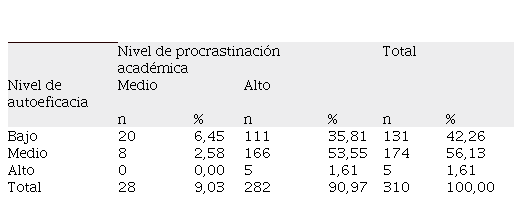 Con relación a los resultados sobre el nivel de relación entre autoeficacia y procrastinación académica, se puede analizar que un porcentaje significativo de estudiantes denotan relación entre las variables de estudio, resaltando el nivel medio de autoeficacia y nivel alto de procrastinación académica con un total de 166 sujetos, correspondientes al 53,55%. En este sentido, los resultados confirman la relación directa entre autoeficacia y procrastinación académica (p = 0.004), lo cual, se evidencia en la inadecuada concepción de sus habilidades y escasa confianza en sí mismos, involucrando una serie de conductas vinculadas con el aplazamiento de actividades referidas a la procrastinación académica, donde las acciones o actividades de índole académico son aplazadas intencionalmente, pudiendo desencadenar una serie de dificultades tanto personales como académicas.