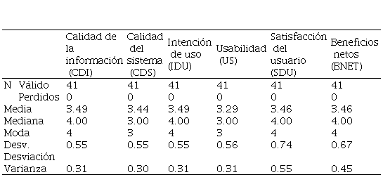 En la Tabla 1, estadísticos de la percepción del éxito de un EVA, se observa que los estudiantes tienen una percepción alta del éxito de los entornos virtuales en el aprendizaje, y; siendo “4” el valor más alto en la escala, las respuestas de los 41 encuestados son muy homogéneas y se concentran muy cerca del valor más alto, tal como lo muestran la Tabla 1 de los estadísticos para cada una de las dimensiones medidas por el instrumento