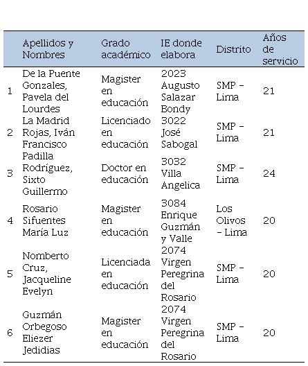 Asimismo, se usó la entrevista como técnica de recopilación de datos, a través de una guía de preguntas semiestructuradas, con la finalidad que los informantes expertos, tuvieran la libertad de manifestar toda la información referente a la evaluación formativa sin desviarse de la pregunta. A su vez, los informantes para el estudio estuvieron conformados por todos aquellos docentes que cumplieron los criterios de inclusión tales como: ser docente en actividad en el nivel secundaria, expertos en la evaluación formativa; que actualmente se encuentren laborando en el entorno virtual y con más de 20 años de experiencia. Es por ello, que hubo un total de seis expertos que fueron sometidos a las entrevistas, donde dieron su consentimiento informado de participar en la investigación, ser grabados y guardar una copia de la grabación de sus entrevistas en un espacio virtual. Todo esto para cumplir con los criterios de auditabilidad. Los expertos mencionados se listan a continuación (ver Tabla 2).