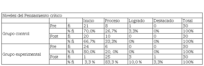 La Tabla 2 se evidencia que los niveles del pensamiento crítico en el pretest del GC se observó un 70% para el nivel inicio, 26.7 % en el nivel proceso, 3.3% para el nivel logrado; mientras en el GE el 80% se ubicó en el nivel inicio, 20% para el nivel proceso. Asimismo, para el pos test del GC llegó al 66.7% en inicio, 33.3 % en proceso; mientras que para el GE se llegó a 3.3 % en inicio, 83,3 % en proceso, 10.0% para el nivel logrado y 3.3% en destacado, estos datos reflejaron mejoras en los logros al aplicar el programa.