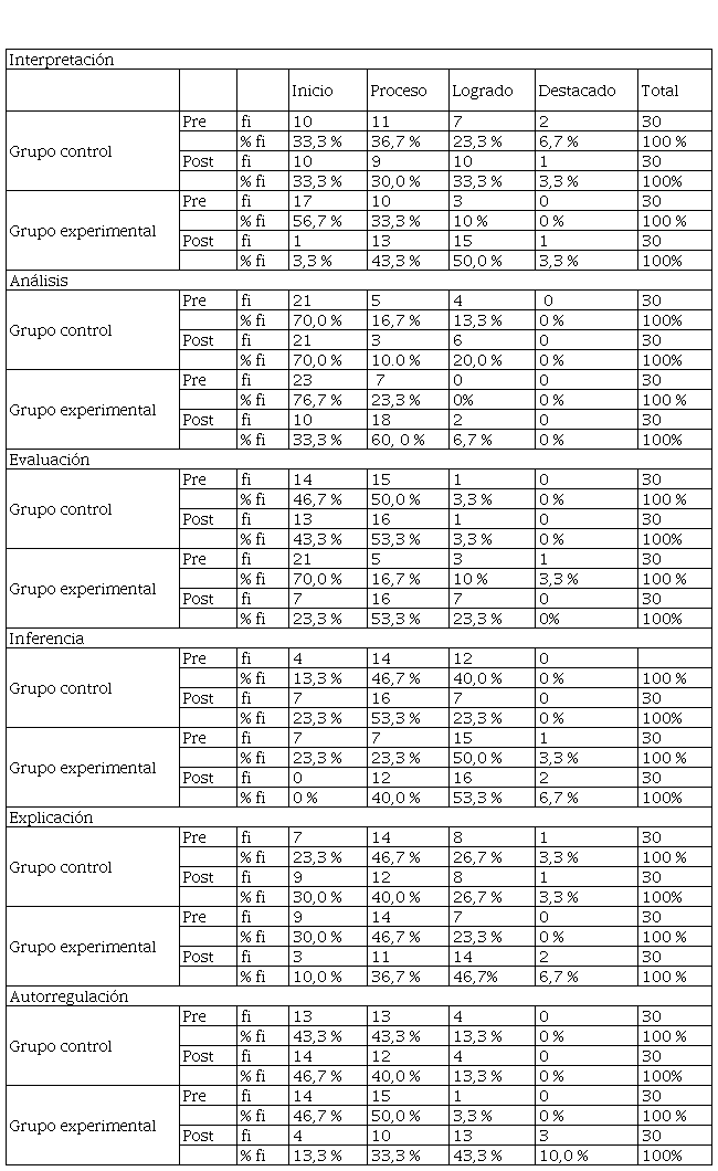 En la Tabla 3 se evidencian las magnitudes de las seis dimensiones del pensamiento opinante consideradas en esta investigación: interpretación, análisis, evaluación, inferencia, explicación y autorregulación; en el grupo control pre test y pos test mostraron condiciones parecidas. Mientras que, en el grupo experimental la dimensión interpretación muestra en el pre test un 56.7% en inicio, 33.3% en proceso y 3% en logrado y en el pos test se aprecia una disminución en el nivel inicio a 1%, se obtuvo una mejora en el nivel proceso 13% ,15% en logrado y 1% en destacado. En la dimensión análisis correspondiente al grupo experimental, se observó en el pre test un 76.7% en el nivel inicio y 23.3% en proceso ya en el pos test hay una mejora porque se reduce el nivel inicio a un 33.3%, 60% en proceso y 6.7% en logrado. La dimensión evaluación del grupo experimental presenta en el pre test un 70% en el nivel inicio, un 16.7% en proceso, un 10% en logrado y 3.3% en destacado; en tanto que, en el pos test obtuvo mejora porque el nivel inicio disminuyó a un 23.3%, el 53.3% en proceso y 23.3% en logrado. La dimensión inferencia en el grupo experimental pre test muestra un 23.3% en inicio, 23.3% en proceso, 50% en logrado y 3.3% en destacado ya en el pos test evidencia mejora porque se reduce el nivel inicio a 0%, 40% en proceso, 53.3% en logrado y 6.7% en destacado. Asimismo, en la dimensión explicación del grupo experimental en el pre test se presenta un 30% en inicio, 46.7% en proceso, 23.3% en logrado y 3.3% en destacado; en el pos test expone una mejora en el nivel inicio que disminuyó a 10%, 36.7% en proceso, aumenta a 46.7% en logrado y 6.7% en destacado. Por último, la dimensión autorregulación en el grupo experimental pre test denota un 46.7% en inicio, 50% en proceso y un 3.3% en logrado, mientras que en el pos test se muestra una mejora en el nivel inicio y el nivel proceso que disminuyen a un 13.3%, 33.3% respectivamente, aumentando en el nivel logrado a 43.3% y el nivel destacado a 10%. Por lo que, se evidencian mejoras en las dimensiones del pensamiento crítico, resultados alcanzados, luego de la implementación del proyecto trabajo colaborativo.