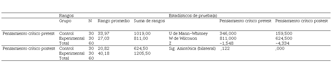 En la Tabla 4 se evidencia que, el rango promedio del pensamiento crítico en el pre test en ambos grupos es similar, no obstante, el rango promedio en el pos test del grupo control es 20,0 y en el grupo experimental es 40,18. De igual forma, la prueba U de Mann Whitney es 159,500 y Z es igual a -4,334 con p=,000<,05 lo que representa que el trabajo colaborativo influye significativamente en el pensamiento crítico, desestimando la hipótesis nula.