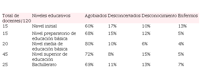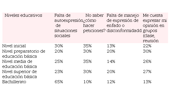 % en los docentes la falta de autoexpresión de situaciones sociales, hacían que los docentes ante las agresiones que recibían les impedía manejar luego de que pasaba la situación volver a tener empatía con los padres. También se demostró que en los otros niveles de docentes de los niveles de inicial a básica superior, también tenían la misma problemática condicen por que los padres y estudiantes eran más susceptibles al cambio.