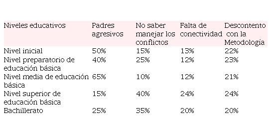 Para determinar que conflictos se les presentaron a los docentes en el proceso de la clase virtual, se presentan los resultados descritos en la Tabla 2, se evidenció que los docentes de educación básica y del nivel inicial en las salas virtuales los padres de los estudiantes de ese nivel fueron agresivos, de igual manera un menor porcentaje de docentes de educación superior básica manifestaron haber tenido padres agresivos, otro aspecto importante para los docentes es que la falta de conectividad se presentaba en mayor cantidad en estudiantes de la básica superior y bachillerato, los docentes manifestaron en 23% los estudiantes y padres del nivel preparatoria desconocían la metodología de educación virtual.