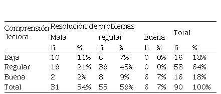 La Tabla 1, destaca los niveles comparativos entre la resolución de problemas matemáticos y la comprensión lectora, donde se muestra una asociación moderada entre las variables, ya que el nivel de ambas variables es bueno, asimismo de muestra que el 34% de los encuestados tiene un nivel malo; respecto a la resolución de problemas matemáticos, el 43% presenta para ambas variables un nivel regular y el 64% de la muestra es regular en comprensión lectora.