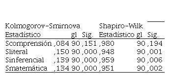 Se realizó una prueba de normalidad para la variable comprensión lectora resultando que el p valor es mayor de 0,5; por otro lado, para las dimensiones comprensión literal e inferencial el p valor es menor a 0.05, por lo que se comprobó que no existe una distribución normal, en consecuencia, para evaluar la correlación de las variables se utilizó la correlación de Spearman.