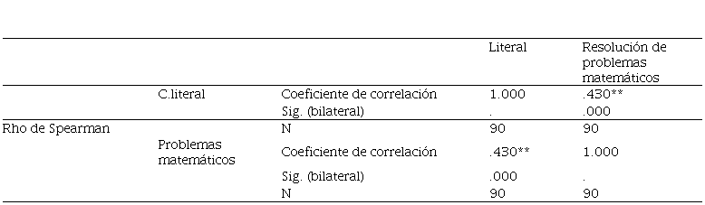 La Tabla 4 destaca que se tiene como p-valor 0.05 > 0.00, por lo que la hipótesis nula es rechazada y se acepta la hipótesis general, la cual muestra que existe una relación significativa entre las estrategias de comprensión lectora literal y la resolución de problemas matemáticos en estudiante de una escuela primaria de Lima. Asimismo, el Coeficiente de Spearman es 0.430, por lo que se concluye que la relación es positiva y moderada.