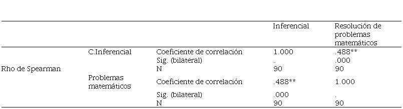 Seguidamente la Tabla 5, muestra como p-valor 0.05 > 0.00, por lo que la hipótesis nula es rechazada y se acepta la hipótesis general, la cual destaca que existe una relación significativa entre las estrategias de comprensión lectora inferencial y la resolución de problemas matemáticos en estudiante de una escuela primaria de Lima. Asimismo, el Coeficiente de Spearman es 0.488, por lo que se concluye que la relación es positiva y moderada.