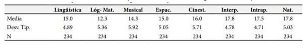 En la Tabla 1 se destaca que la inteligencia interpersonal tiene una media de 17.8 y una desviación típica de 4.78. Así mismo, la inteligencia naturalista presenta una media de 17.5 y una desviación típica de 5.03. En tercer lugar, se aprecia a la inteligencia intrapersonal con una media de 17.5 y una desviación típica de 4.71. Según el resultado, la inteligencia interpersonal y la naturalista presentan mayor predominio en el grupo de estudiantes; seguido por la inteligencia intrapersonal. Por otro lado, se aprecia que la inteligencia musical con una media de 14.3 y a la inteligencia lógico-matemática con una media de 12.3 son las que menores puntuaciones presentan en promedio.
