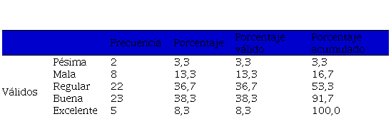 Los resultados obtenidos en esta pregunta de acuerdo a los datos proporcionados mostraron que el 41.67% de los encuestados perciben la imagen del cantón Sucre como buena, un 30% como regular, y un 16,7% como mala y el 10% muestra que la imagen es excelente, mientras que el 1,67% manifiestan que es pésima. (Tabla 3)