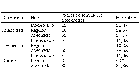 Por otra parte, respecto a la dimensión intensidad de la actividad deportiva se denota que un 50% considera que la intensidad es adecuad, un 28,6% percibe que es regular y el 21,4% opina que es inadecuada; asimismo, respecto a la dimensión frecuencia con la que se realiza la actividad deportiva, se observa que el 78,6% de los padres de familia y/o apoderados encuestados opina que es adecuado la frecuencia con que se realiza la actividad deportiva, por otra parte, el 11,4% opina que es inadecuada dicha frecuencia, y el 10,0% percibe que dicha frecuencia es regular. En ese mismo sentido, respecto a la dimensión duración con la que se realiza la actividad deportiva, un 88,6% de los padres de familia y/o apoderados encuestados percibe como adecuada la duración de la actividad deportiva, sin embargo, el 11,4% la considera inadecuada.