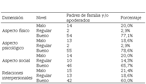 De igual forma, respecto a la dimensión aspecto físico, se tiene que un 77,1% considera sus menores hijos presentan un aspecto físico bueno, un 20,0% percibe que es malo y el 2,9% considera que es regular, asimismo, respecto a la dimensión aspecto psicológico, se tiene que el 78,6% de los padres de familia y/o apoderados encuestados percibe que sus menores hijos presentan un buen aspecto psicológico, por otro lado, el 18,6% opina que tienen un mal aspecto físico, y únicamente el 2,9% considera que dicho aspecto es regular. Ahora bien, respecto a la dimensión aspecto social, se observa que en un 65,7% de los padres de familia y/o apoderados encuestado opinan que sus menores hijos presentan un buen aspecto social, sin embargo, el 20,0% opina que tienen un mal aspecto social, y únicamente el 14,3% considera que dicho aspecto es regular.