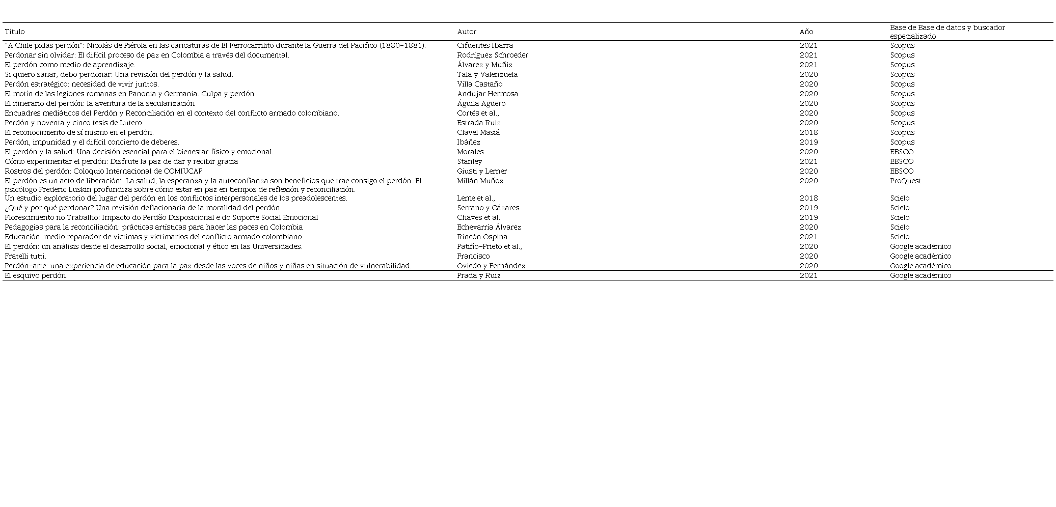 En la Tabla 1 se presenta la estructura de las fuentes analizadas, sobre el perdón en la convivencia escolar, ubicados en las principales bases de datos para ser sistematizados en torno al eje temático indicado anteriormente.