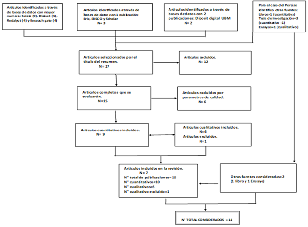 La estrategia metodológica realizada fue una revisión sistemática, basada en el conocimiento de lo encontrado, la lectura o revisión (artículos de revisión), como trabajo bibliográfico evaluativo, que consideró 32 artículos de carácter documental, entre ellos, el análisis cualitativo y cuantitativo. Los artículos seleccionados se tomaron de bases de datos como Scopus, Scielo, Redalyct y Google Scholar, entre otras. Como criterios de inclusión fueron considerados estudio publicados hasta el 2020; que tuvieran pertinencia con el tema. Los planes de búsqueda se generaron de forma independiente en cada base de datos.