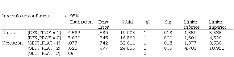 En la Tabla 1 se reflejan los resultados obtenidos de la prueba de hipótesis general, con estos se establece la incidencia de la gestión institucional de plataformas educativas virtuales en el desempeño profesional en docentes de educación básica regular. En la Tabla 1 se observa que, la prueba Wald dio un puntaje de 19,005, siendo mayor a 4 y representando el punto de corte en el modelo analizado. Tiene un nivel de significancia de p: ,016 < ,050, permitiendo rechazar la hipótesis nula y también inferir que las plataformas educativas virtuales inciden significativamente en el desempeño profesional en docentes de educación básica regular