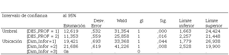 En cuanto a Tabla 2, se observan los resultados obtenidos en la prueba de hipótesis para la incidencia de la dimensión informativa en el desempeño profesional en docentes de educación básica regular. Se evidencia que, se obtuvo un puntaje Wald de 31,354, siendo mayor que 4, representando el punto de corte en el modelo estudiado. Posee un nivel de significancia de p: ,000 < ,050, rechazando la hipótesis nula e infiriendo que la dimensión informativa incide significativamente en el desempeño profesional en docentes de educación básica regular.