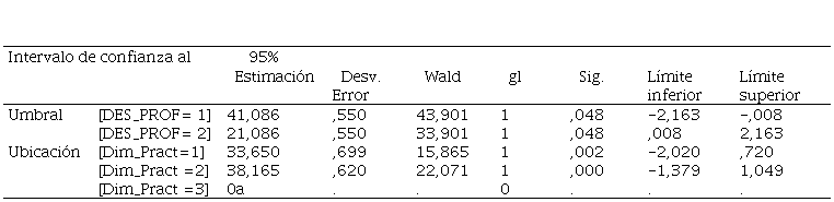 En la Tabla 3 se especifican los datos obtenidos en la prueba con respecto a la incidencia de la dimensión práctica en el desempeño profesional en docentes de educación básica regular. Asimismo, se observa que la prueba Wald dio un puntaje de 43,901, siendo mayor que 4 y representando el punto de corte en este modelo. El nivel de significancia es p: ,048 < ,050, lo que rechazaría la hipótesis nula y la inferencia en la dimensión práctica incide significativamente en el desempeño profesional docente de la Institución Educativa 2090, Lima.