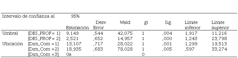 De acuerdo a la Tabla 4, se muestran las variables correspondientes a la prueba de hipótesis, los cuales ayudarán a determinar el nivel de incidencia de la dimensión comunicativa con respecto al desempeño profesional docente en la Institución Educativa 2090, Lima. En cuanto al puntaje Wald, este es de 42,075, siendo mayor que 4 por lo que representaría el punto de corte en dicho modelo estudiado. Cuenta con un nivel de significancia de p: ,004 < ,050, y rechaza la hipótesis nula, infiriendo que la dimensión comunicativa incide significativamente en el desempeño profesional docente de la Institución Educativa 2090, Lima