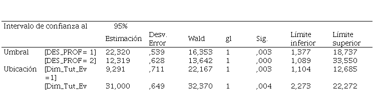 De acuerdo a la Tabla 5, los resultados obtenidos a partir de la prueba, permitirán determinar la incidencia de la dimensión tutorial-evaluativa con respecto al desempeño profesional docente. Teniendo en cuenta lo obtenido en la prueba Wald, la cual es 16,353, siendo superior a 4 y representando el punto de corte en dicho modelo estudiado, con un nivel de significancia de p: ,003 < ,050, se rechazaría la hipótesis nula y se concluye que la dimensión tutorial-evaluativa incide significativamente en el desempeño profesional docente de la Institución Educativa 2090, Lima