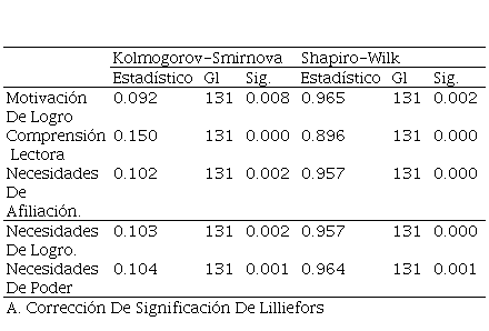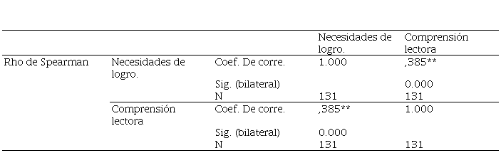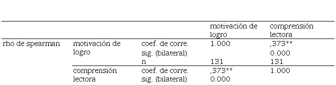 En la Tabla 1 se puede observar que de los 131 los elementos intervinientes, se acepta el criterio de Kolmogorov-Smirnova por estar superando los 50 elementos; se observa que en la columna de significancia hay una igualdad; es decir, la variable Motivación de logro, junto a sus dimensiones y la variable Comprensión lectora tienen como resultado a un p < 0.05, el cual indica que aceptamos la hipótesis alternativa; pues, los datos no tienen distribución normal; por lo que se aplicó estadística no paramétrica; a través de la determinación del coeficiente de Rho de Speman.