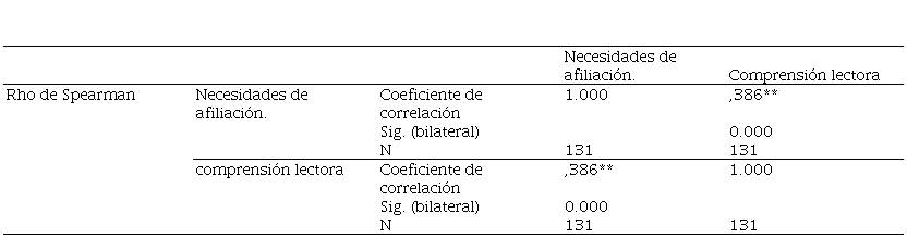 La Tabla 3 se observa que el coeficiente de correlación de Rho de Speman arroja 0.386* indicando una correlación apreciable con relación al valor de significancia que es igual a 0.000 y a su vez es inferior a 0.05 lo que permite aceptar la hipótesis alternativa específica, es decir, se entiende que las necesidades de afiliación se relacionan significativamente con la comprensión lectora en alumnos del tercer grado del nivel secundario de instituciones educativas de Huarmaca, 2022.