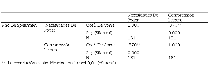 H1: Las necesidades de poder se relacionan significativamente con Comprensión lectora en los estudiantes