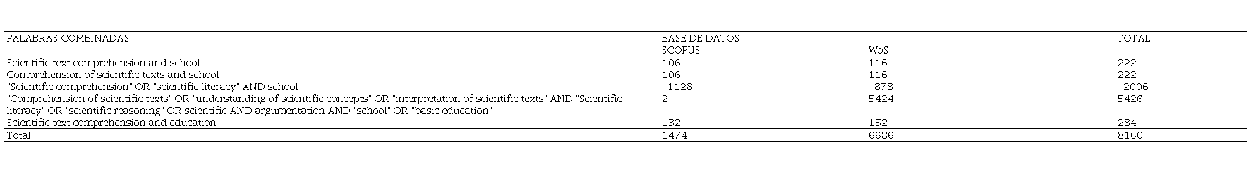 Para la búsqueda de información en español e inglés se realizaron las siguientes combinaciones utilizando los operadores booleanos AND, OR. Los resultados iniciales de la búsqueda fueron en la base de datos Scopus se obtuvo un total de 1474 artículos y WoS se obtuvo un total de 6686 artículos en total considerando las dos bases de datos se llegaron a 8160 artículos primarios que consideraron todo tipo de artículos de investigación relacionados a comprensión de textos y alfabetización científica (Tabla 1).