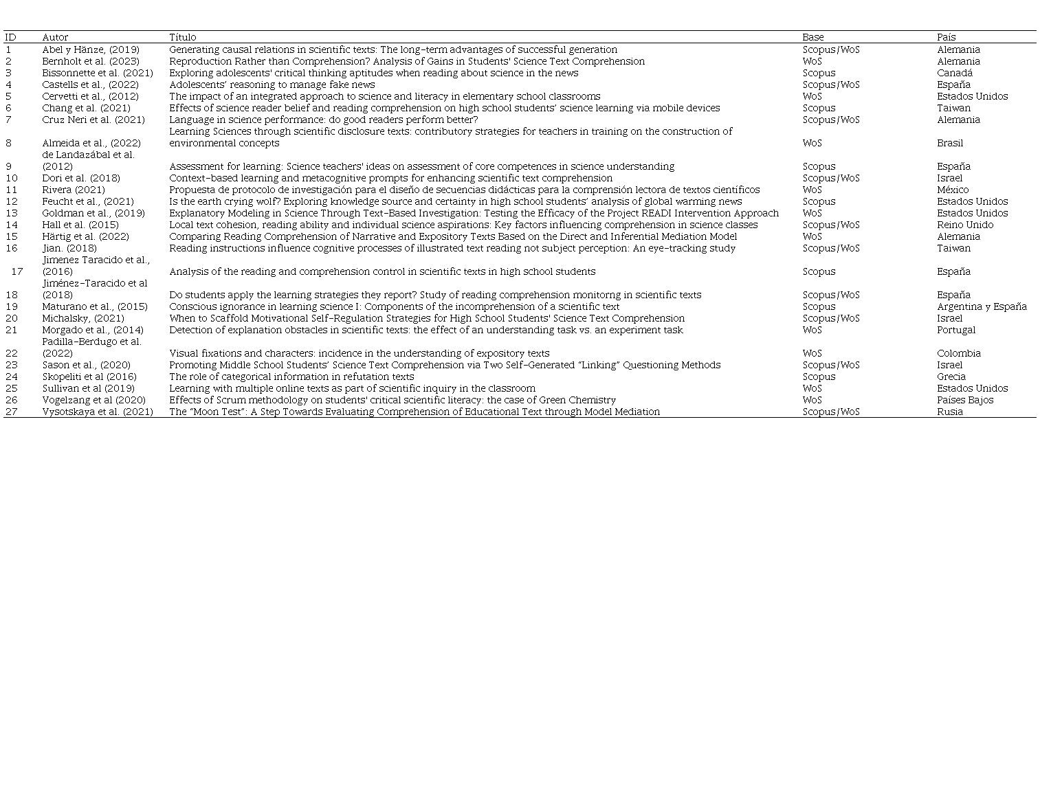 En la Tabla 2, a partir de la revisión realizada se presentan los 27 artículos donde se muestra el año, países y bases de datos podemos observar que el mayor número de artículos primarios publicados sobre el estudio se han realizado en el año 2021 y en el año 2022 con 7 y 4 artículos, respectivamente. En cuanto la base de datos entre los años 2013 y 2017 no han sido publicados trabajos sobre esta temática; en cuanto a las bases de datos existen 7 artículos en Scopus y 9 artículos en WoS, mientras que en Scopus y WoS se encuentran 11 artículos. Los estudios realizados sobre comprensión de textos y alfabetización científica en función a los criterios de inclusión y exclusión, de los 27 autores, la mayor producción fue de Alemania, España y Estados Unidos.