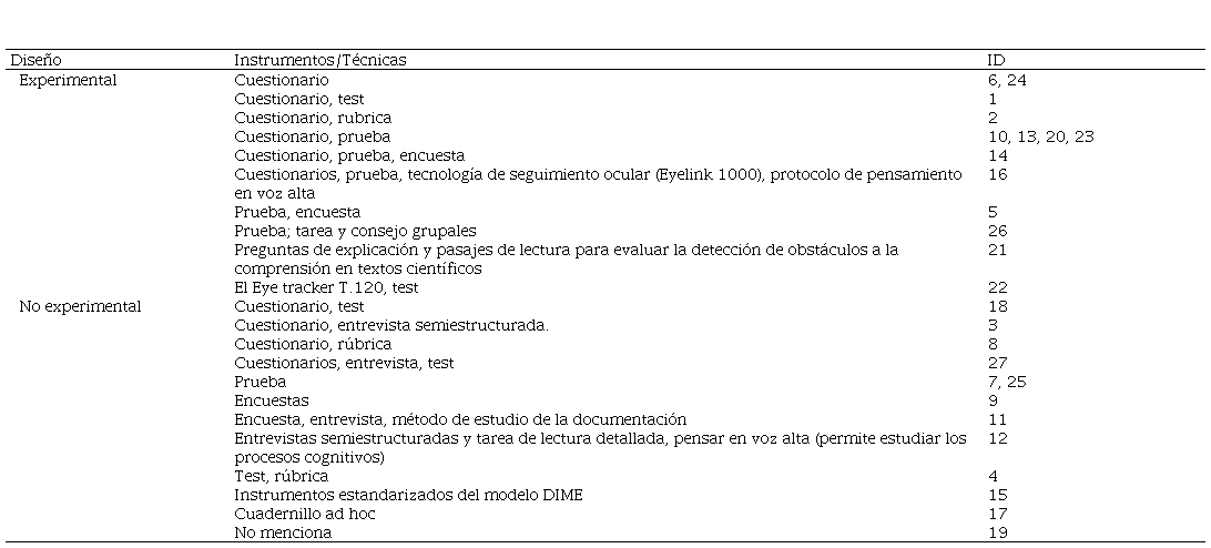 En la Tabla 3, los artículos de diseños de investigación tanto experimental y no experimental usan los cuestionarios como, el cuestionario de autoeficacia lectora (Jian, 2018), cuestionario de estrategias de lectura (Dori et al., 2018), cuestionario metamotivacional (Michalsky, 2021), cuestionario de estrategias de aprendizaje (Jiménez-Taracido y Manzanal-Martínez, 2018), entre otros, los que permitieron a los autores a obtener información de los participantes de forma directa.
