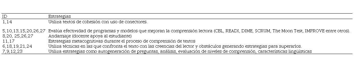 En la Tabla 4, se muestran diversas estrategias empleadas en los estudios analizados a fin de mejorar la comprensión lectora de textos científicos, se puede observar el uso de programas y modelos que permiten la mejora de la comprensión lectora, quienes aplican una batería de instrumentos y técnicas a fin de alcanzar su objetivo.