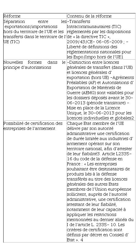 Somme toute, les réformes afférentes au système de contrôle des exportations et des transferts intracommunautaires de matériels de guerre sont les suivantes :