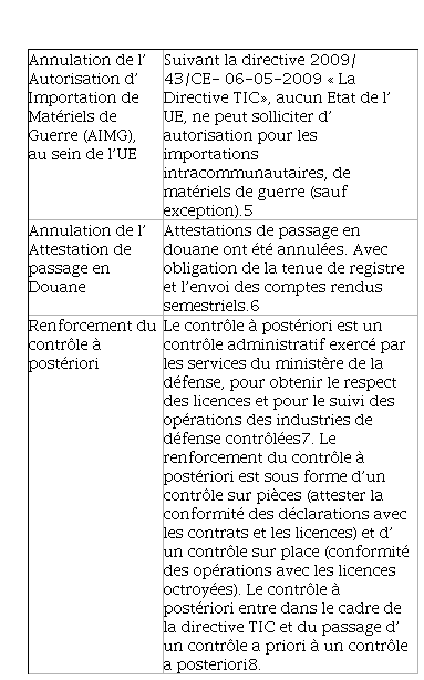 Annulation de l’Autorisation d’Importation de Matériels de Guerre (AIMG), au sein de l’UE Suivant la directive 2009/ 43/CE- 06-05-2009 « La Directive TIC», aucun Etat de l’UE, ne peut solliciter d’autorisation pour les importations intracommunautaires, de matériels de guerre (sauf exception).5 Annulation de l’Attestation de passage en Douane Attestations de passage en douane ont été annulées. Avec obligation de la tenue de registre et l’envoi des comptes rendus semestriels.6 Renforcement du contrôle à postériori Le contrôle à postériori est un contrôle administratif exercé par les services du ministère de la défense, pour obtenir le respect des licences et pour le suivi des opérations des industries de défense contrôlées7. Le renforcement du contrôle à postériori est sous forme d’un contrôle sur pièces (attester la conformité des déclarations avec les contrats et les licences) et d’un contrôle sur place (conformité des opérations avec les licences octroyées). Le contrôle à postériori entre dans le cadre de la directive TIC et du passage d’un contrôle a priori à un contrôle a posteriori8. Importar tabla