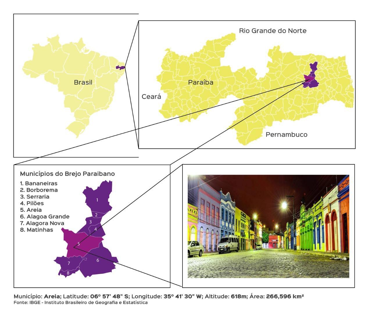 Ubicada en el estado de Paraíba, en el nordeste del Brasil (Figura 1), la microrregión del Brejo se encuentra en la región Agreste[iv], en la parte oriental de la meseta de Borborema, cuya posición geográfica presenta un clima húmedo con un índice de precipitación más alto que otras regiones del estado (Almeida, 1980). Con fuerte tradición agraria, Areia, la principal ciudad de la región, tuvo relevancia en el escenario de Paraíba en el siglo XIX, no sólo desde el punto de vista económico, sino también desde el punto de vista político y cultural. Después de que sus tierras se emplearon en el cultivo de algodón, café y sisal, en el siglo XX estuvo marcada por la presencia de plantaciones de caña de azúcar debido a la implementación de la planta Santa María en 1931, hasta su quiebra en 1992 (Soffiati, 2022).