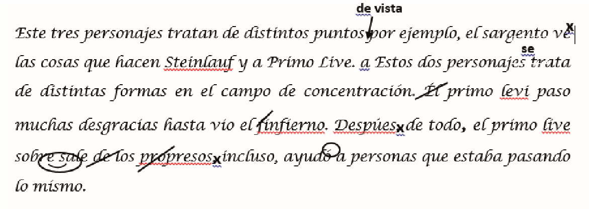 Visualmente, una edición como la que mostramos puede resultar abrumadora si se repite en todos los párrafos del examen, tal como sucedió. Por la cantidad de ediciones, podemos observar que existe una gran diferencia entre el texto que el profesor espera que se escriba en términos formales y el texto que realmente produce la estudiante. Así mismo, la edición se muestra como un recurso no dialógico desde el plano interpersonal, pues construye un receptor sin agencia.