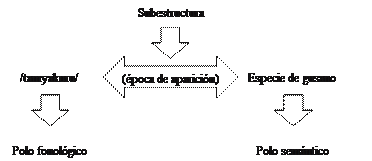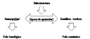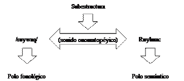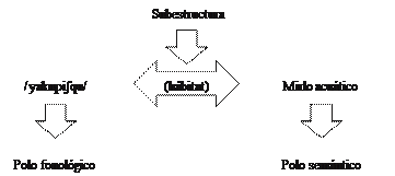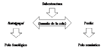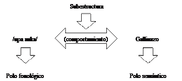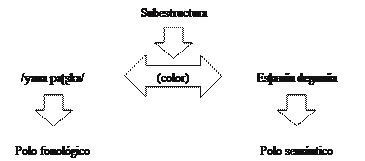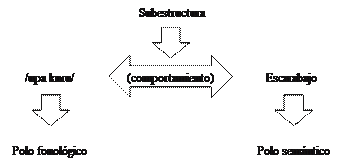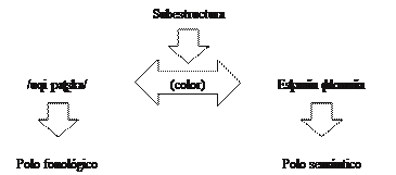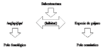 Como en la Figura 13, este esquema igualmente nos muestra que el polo fonológico se vincula al polo semántico mediante la subestructura comportamiento. En definitiva, también el alcance del concepto gallinazo exhibe más subestructuras relativas, por ejemplo, a su color o su alimentación. No obstante, la característica resaltada, que ha sido tomada como base,es el comportamiento del ave.