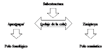 El zoónimo propuesto conceptualmente alude a la zarigüeya. Esta etiqueta se genera a partir de la conceptualización de la forma del rabo de este animal como una característica saliente para los quechuahablantes centrales. El nombre de la zarigüeya, precisamente, surge sobre la base de la focalización de su rabo sin pelaje. La esquematización de este proceso de nominación se ofrece en la siguiente figura: