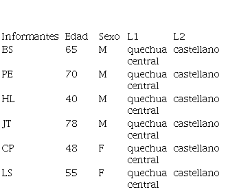 En relación con la selección de los informantes, la investigación se llevó a cabo con un total de seis hablantes del quechua central. Las características sociolingüísticas de estos hablantes fueron las siguientes: usuarios del quechua central en un rango etario de 40-75 años, que residían o habían residido la mayor parte de sus vidas en sus comunidades. En seguida, mostramos los datos básicos de los informantes seleccionados, quienes han sido etiquetados según las iniciales de sus nombres: