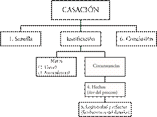 La casación es un género discursivo que contiene una estructura fijada por el uso y que comprende la sumilla, la justificación (conformada por los vistos y los antecedentes), el repaso de los hechos, los fundamentos de derecho y la conclusión (decisión). Esta estructura es una instancia de la secuencia argumentativa propuesta por Van Dijk (1992):