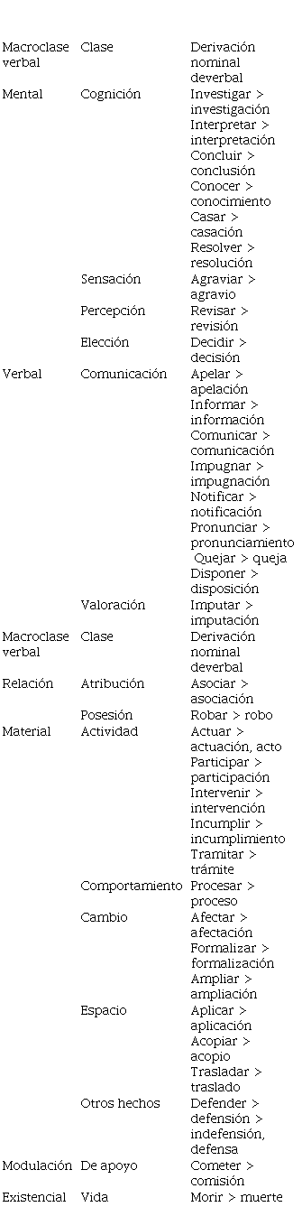 Por otro lado, la nominalización es un proceso recurrente en los textos analizados. Los sustantivos de acción y efecto contienen principalmente los sufijos {-ción} y sus variantes, {-ión} y {-sión}; {-miento}, y los sufijos verbales {-a}, {-e} y {-o}. De acuerdo con la clasificación semántica de ADESSE (Universidad de Vigo, 2002), estos sustantivos proceden de verbos de diferentes clases semánticas, sobre todo de la macroclase material, como mostramos en la siguiente tabla: