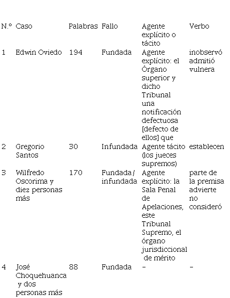 Al estudiar las otras tres casaciones (ver Anexos 2-4), advertimos que la extensión de la sumilla varía de acuerdo con el fallo. Así, cuando es infundado, el texto es más breve (30 palabras en la casación de Gregorio Santos); pero, cuando es fundado, se requiere de mayor argumentación, como mostramos en la Tabla 2.